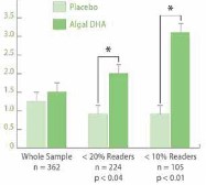 Secondo i suggerimenti del Ministero della Salute, le donne vegane dovrebbero quindi consumare alimenti ricchi di DHA. In commercio, esistono integratori appositamente sviluppati per rispondere a queste esigenze. IL DHA brevettato proveniente dalla microalga Schizochytrium sp., presenta alti livelli di DHA e bassi livelli di EPA. Infatti non si consigliano supplementazioni di EPA + DHA in gravidanza per i possibili effetti competitivi dell’EPA nei confronti dell’acido arachidonico, che nella fase fetale è fondamentale per i processi di crescita. Gli oli ottenuti da questa microalga presentano un maggior grado di purezza di DHA e possono essere quindi suggeriti a vegetariani e vegani. Il DHA algale è stato studiato anche nella popolazione infantile. Uno studio clinico randomizzato in doppio-cieco recentemente pubblicato sulla rivista PLoS One ha trovato che l’integrazione con 600 mg di DHA proveniente da alghe per 16 settimane migliora la capacità di lettura e di comportamento in bambini sani in età tra 7 e 9 anni con punteggi bassi in lettura (Richardson et al 2012). La Fig. 2 mostra l’aumento della capacità di lettura, in bambini divisi per percentile di lettura (10% e 20%), ai quali è stato somministrato DHA derivato da microalga rispetto ai bambini del gruppo placebo.