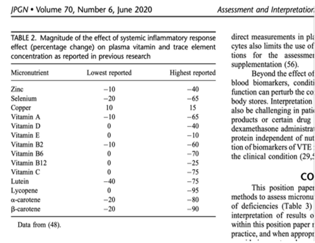 Gerasimidis K, Bronsky J, Catchpole A, Embleton N, Fewtrell M, Hojsak I, Indrio F, Hulst J, Köglmeier J, de Koning B, Lapillonne A, Molgaard C, Moltu SJ, Norsa L, Verduci E, Domellöf M; ESPGHAN Committee on Nutrition. Assessment and Interpretation of Vitamin and Trace Element Status in Sick Children: A Position Paper From the European Society for Paediatric Gastroenterology Hepatology, and Nutrition Committee on Nutrition. J Pediatr Gastroenterol Nutr. 2020 Jun;70(6):873- 881.