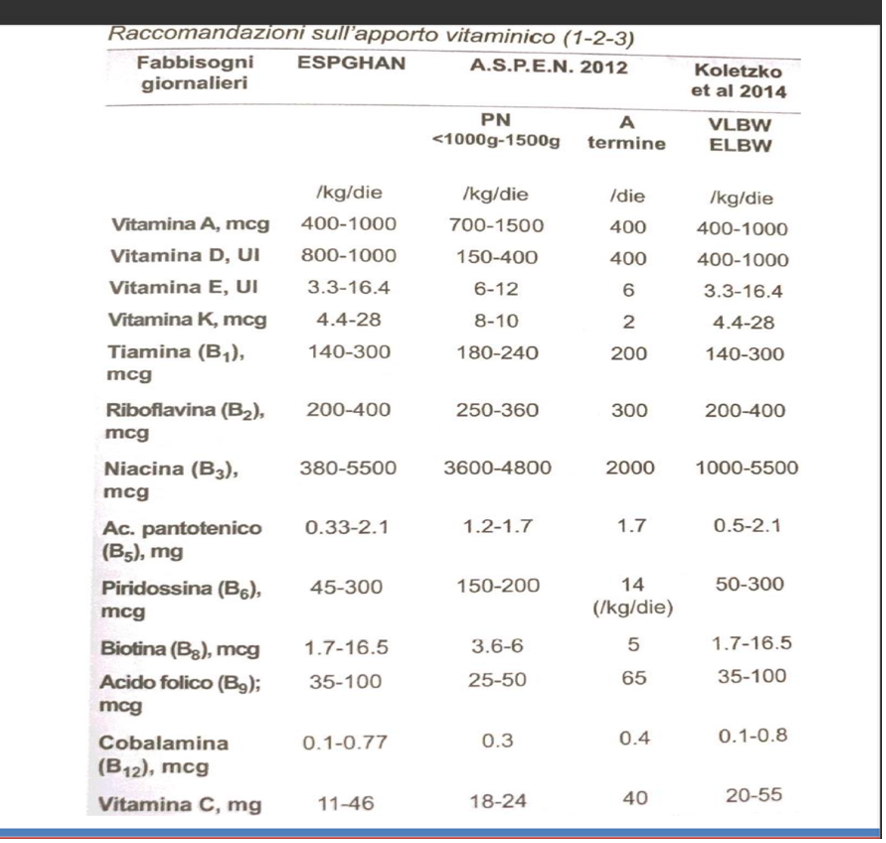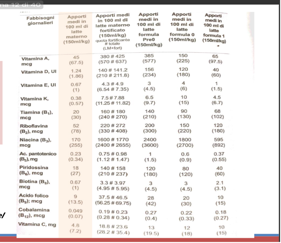 -) latte materno fortificato o latte di formula pre0 è necessaria la supplementazione con multivitaminico fino al raggiungimento della quota di 150 ml/Kg (comunque vitamina A D E e niacina sono comunque insufficienti) .