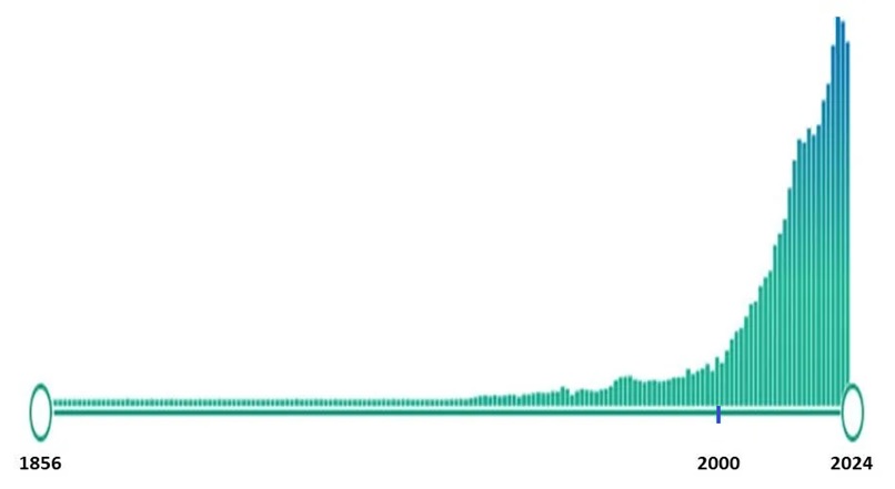 Crescita temporale degli studi sui funghi medicinali pubblicati su PubMed dal 1856 al 2024.