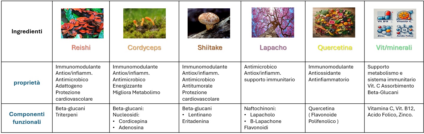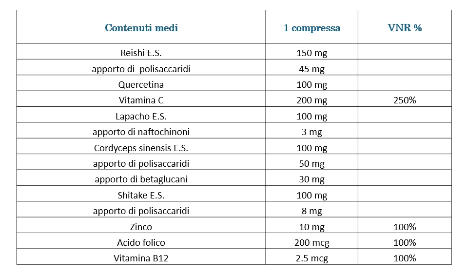 • Il reishi, il lapacho, lo shitake ed il cordyceps contribuiscono a mantenere le naturali difese dell’organismo.