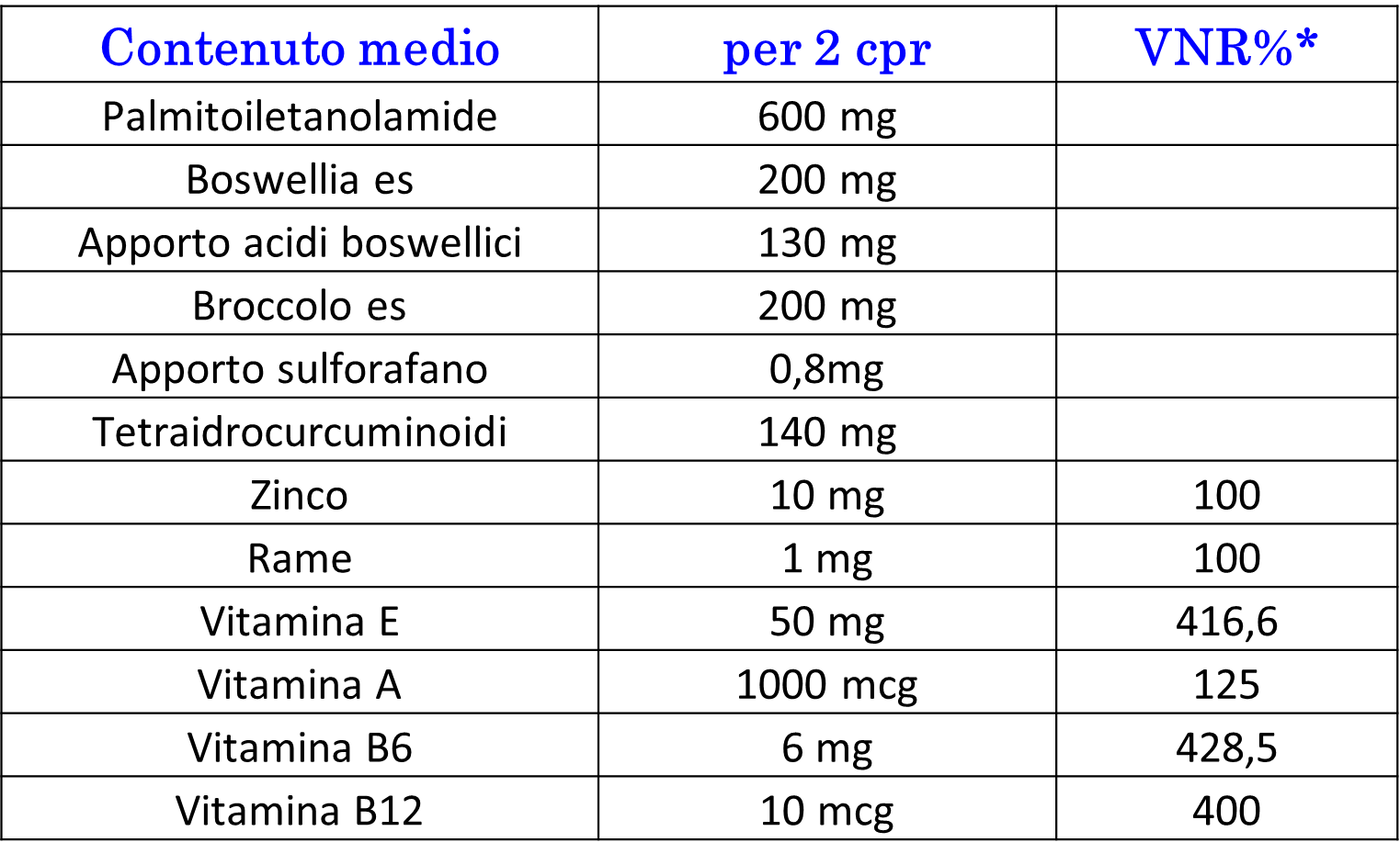 - Dolore post-operatorio: iniziare la supplementazione di una compressa tre giorni prima dell’intervento e proseguire con due compresse per tutta la convalescenza.