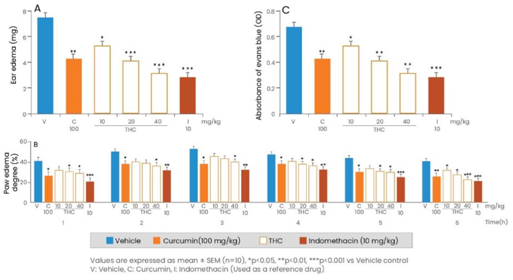 La Tetraidrocurcumina ha dimostrato, nel confronto in tre modelli animali (A, B, C) con la Curcumina e l’Indometacina (un potente antinfiammatorio):