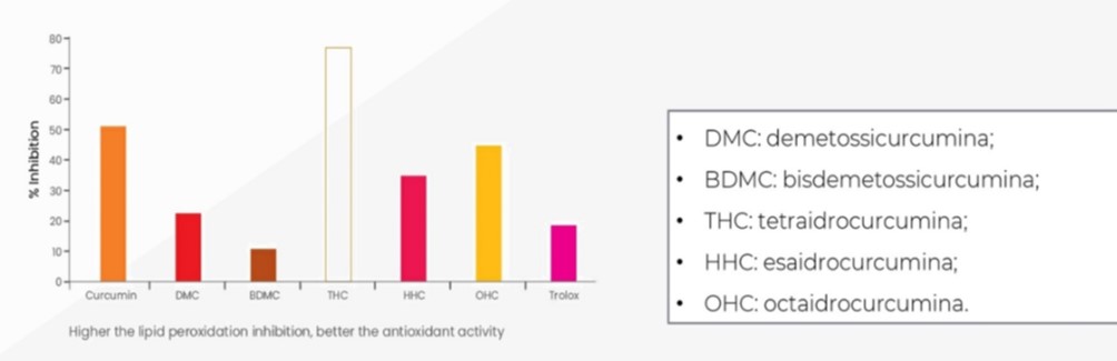 Il grafico sottostante mette a confronto l’attività antiossidante della curcumina, di alcuni suoi derivati (idrogenati e non) e Trolox (un analogo idrosolubile della vitamina E con potenti effetti antiossidanti) in un modello di perossidazione lipidica da cui appare evidente che la THC dimostra una maggiore inibizione della perossidazione e quindi una migliore attività antiossidante.